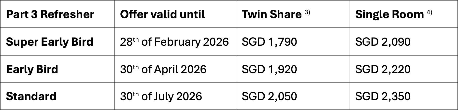 4) Single rooms - spouses / partners are welcome for an additional S$25/per room night, which includes breakfast